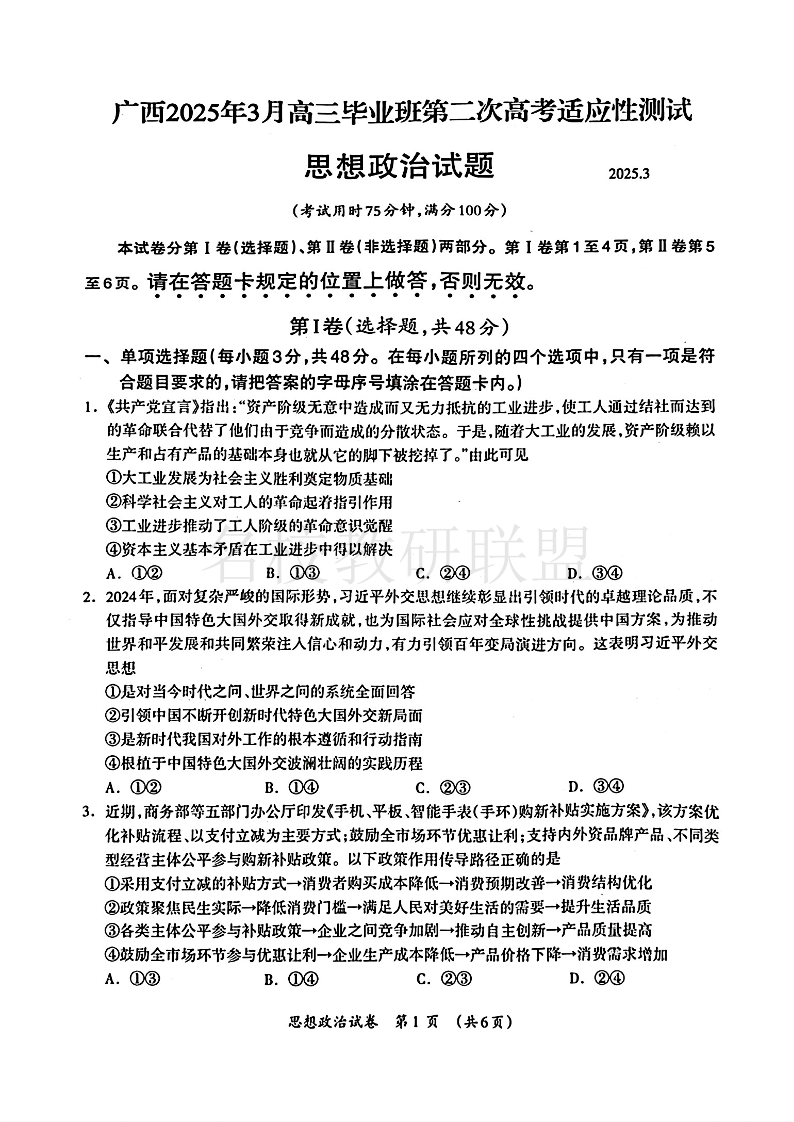 广西2025年3月高三毕业班第二次适应性考试 政治.pdf