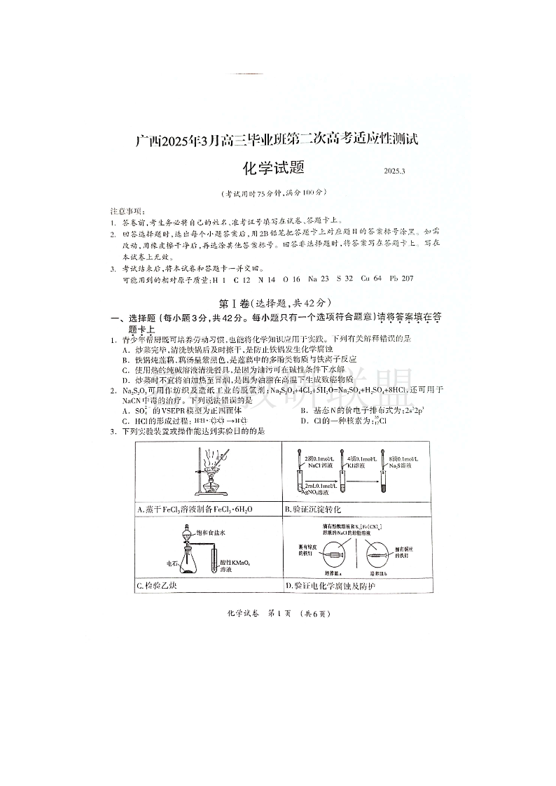 广西2025年3月高三毕业班第二次适应性考试 化学.pdf