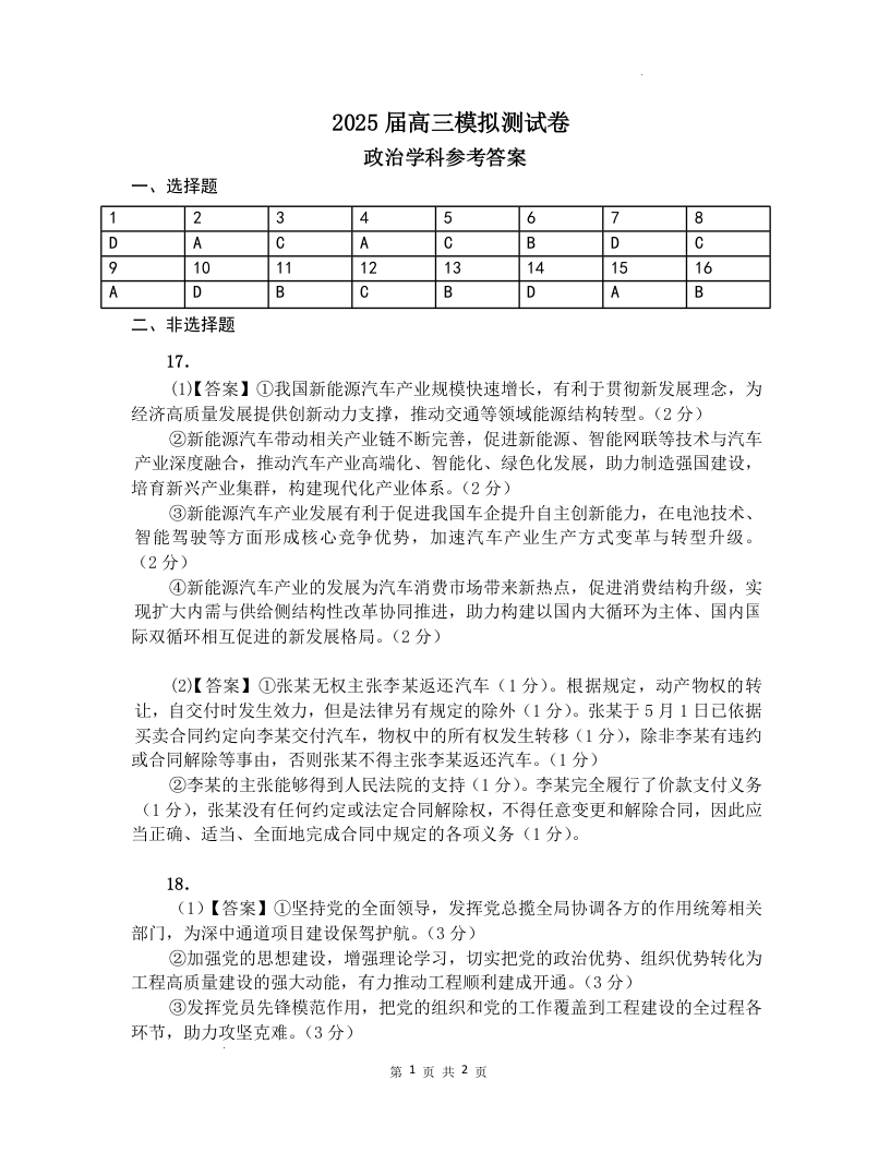 广州外国语学校2025届高三3月模拟测试卷 政治答案.docx