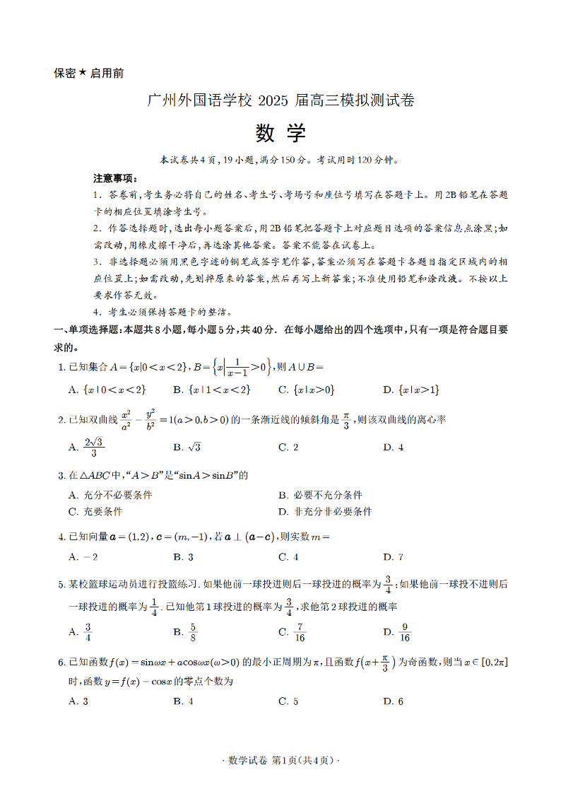 广州外国语学校2025届高三3月模拟测试卷 数学.pdf