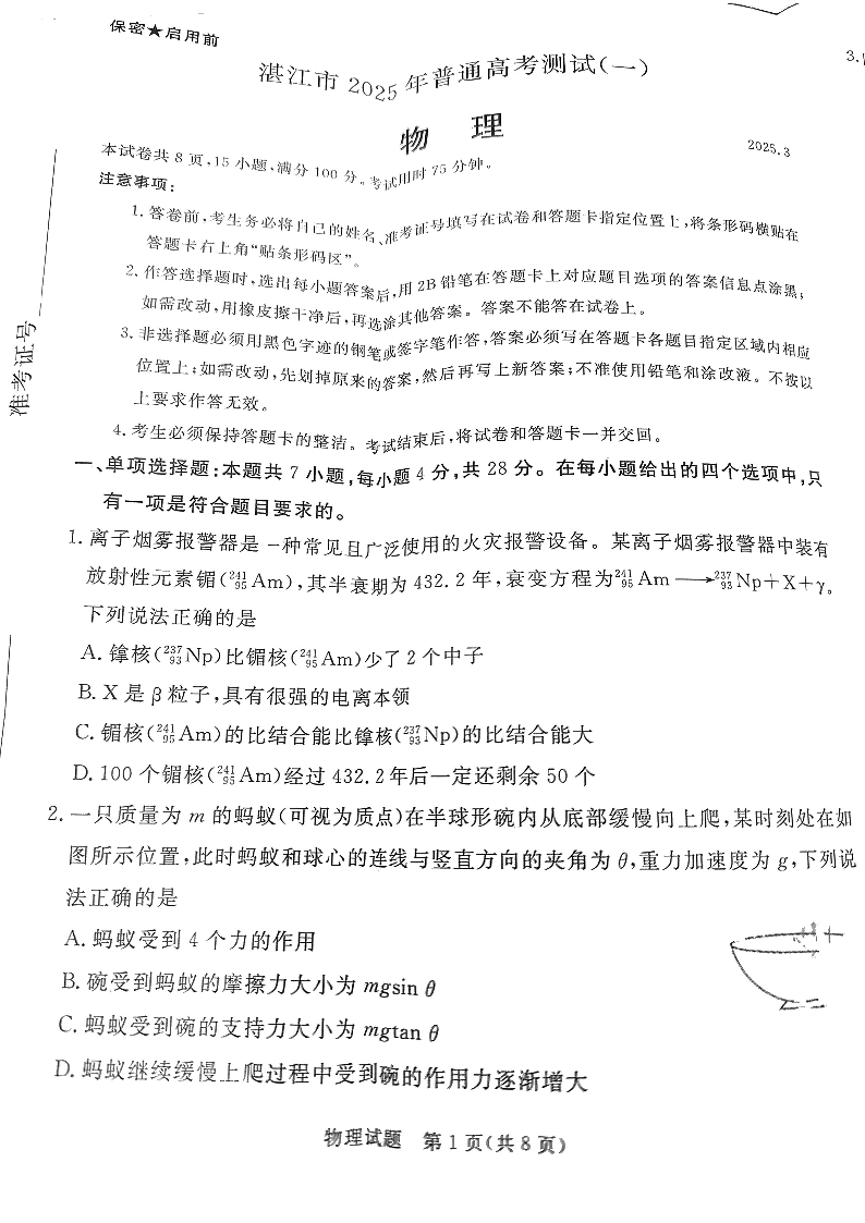 广东省湛江市2025年普通高考测试(一)物理.pdf