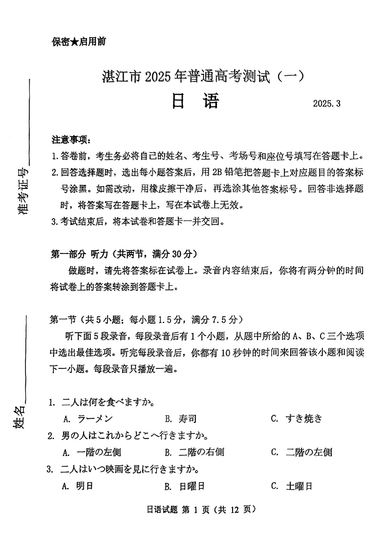 广东省湛江市2025年普通高考测试(一)日语.pdf