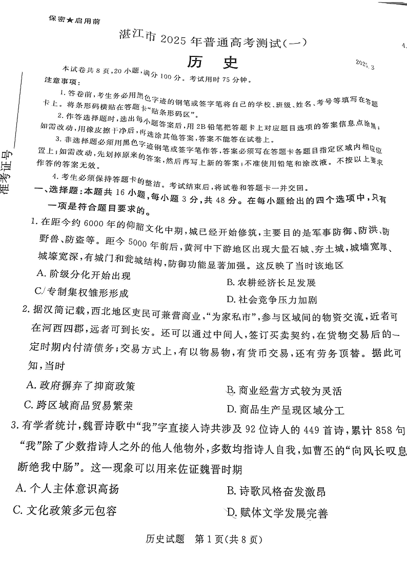 广东省湛江市2025年普通高考测试(一)历史.pdf