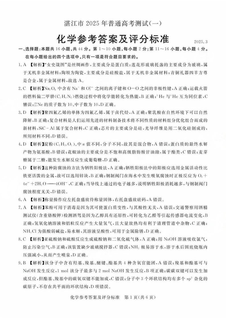广东省湛江市2025年普通高考测试(一)化学答案.pdf