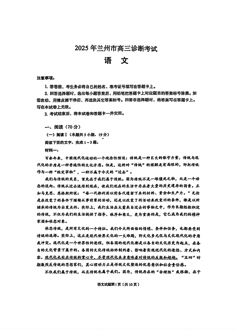 甘肃省兰州市2025年高三诊断考试 语文.pdf