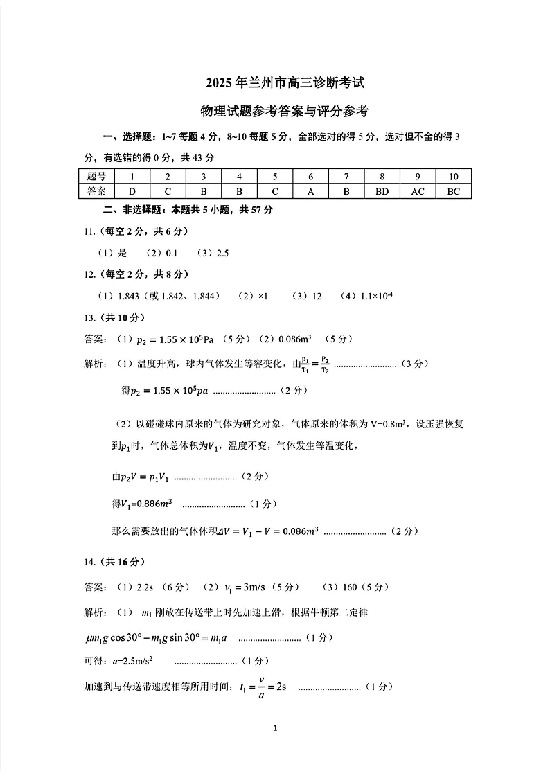 甘肃省兰州市2025年高三诊断考试 物理答案.pdf