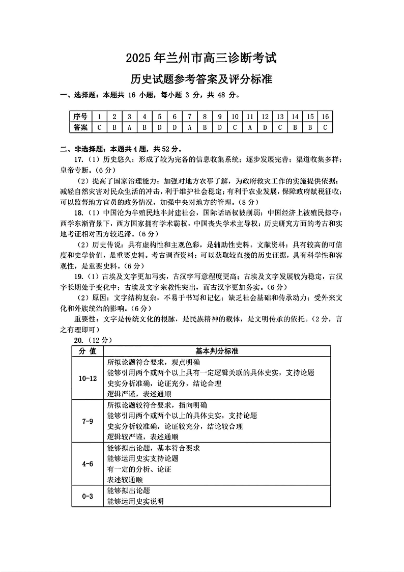 甘肃省兰州市2025年高三诊断考试 历史答案.pdf