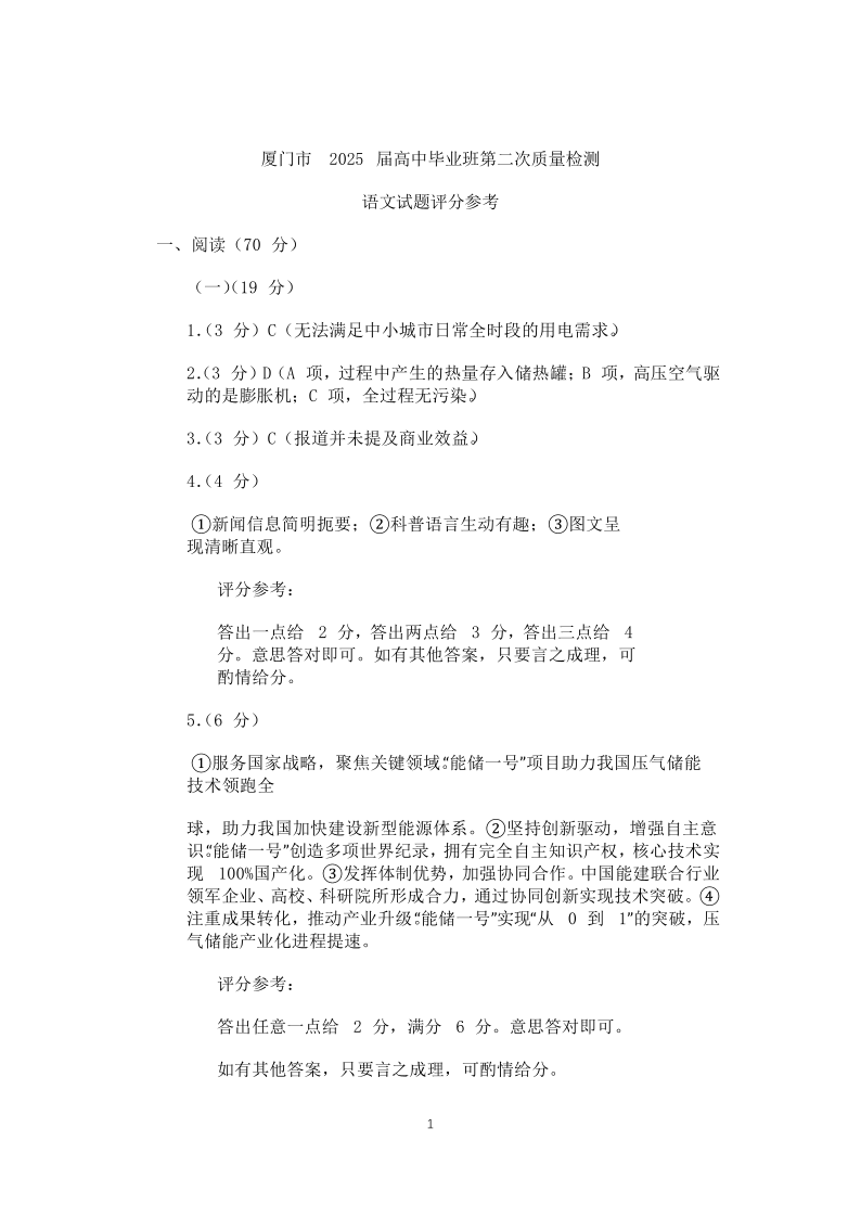 福建省厦门市2025届高中毕业班第二次质量检测 语文答案.pdf