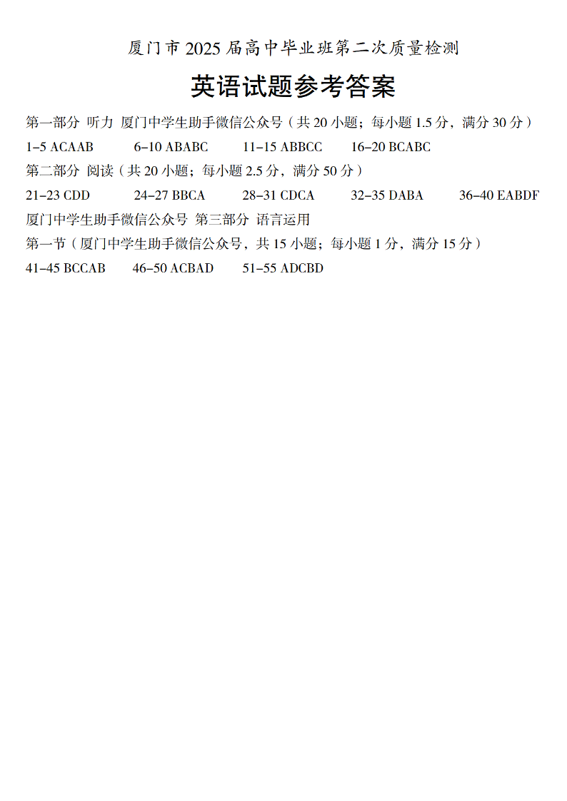 福建省厦门市2025届高中毕业班第二次质量检测 英语答案.pdf