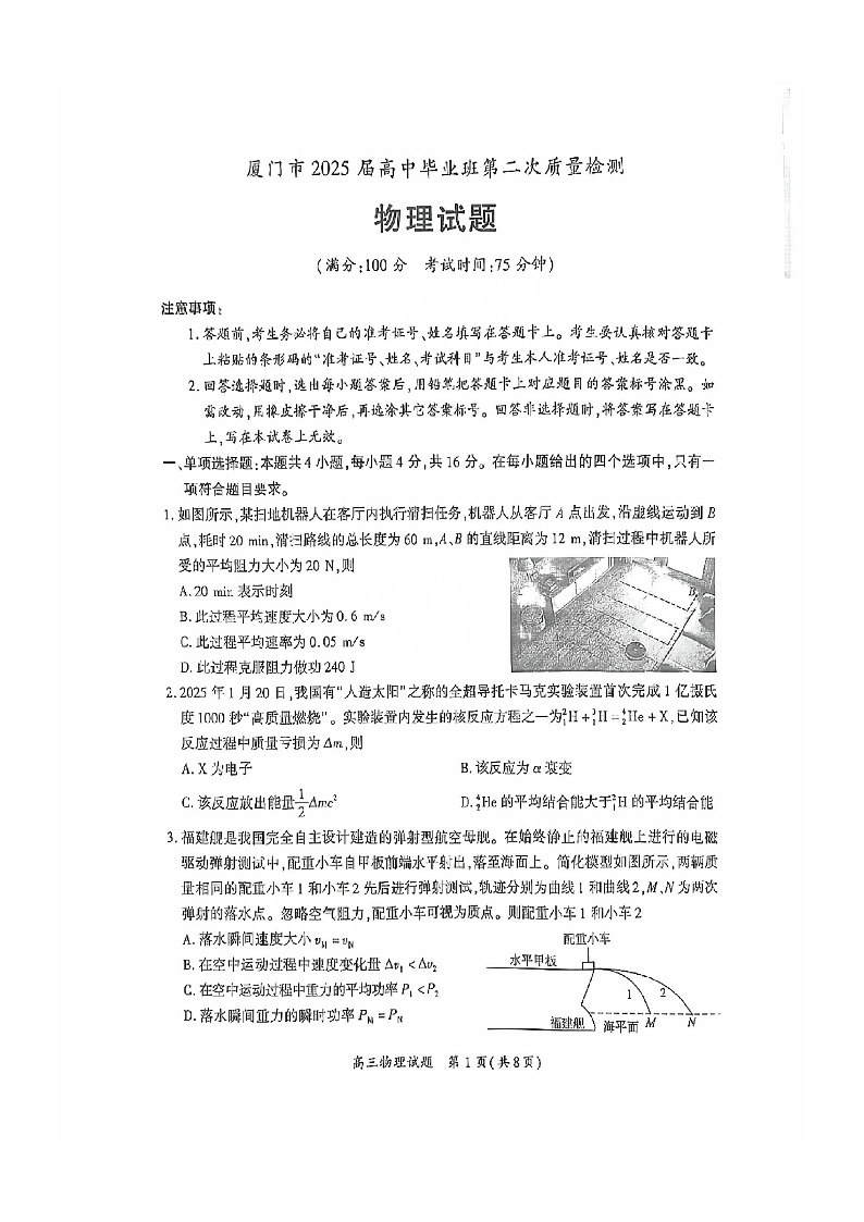 福建省厦门市2025届高中毕业班第二次质量检测 物理.pdf
