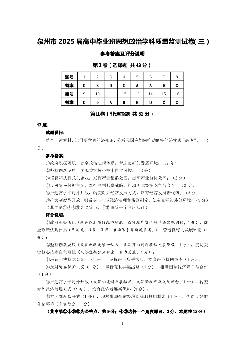 泉州市2025 届高中毕业班质量监测(三)政治答案.pdf