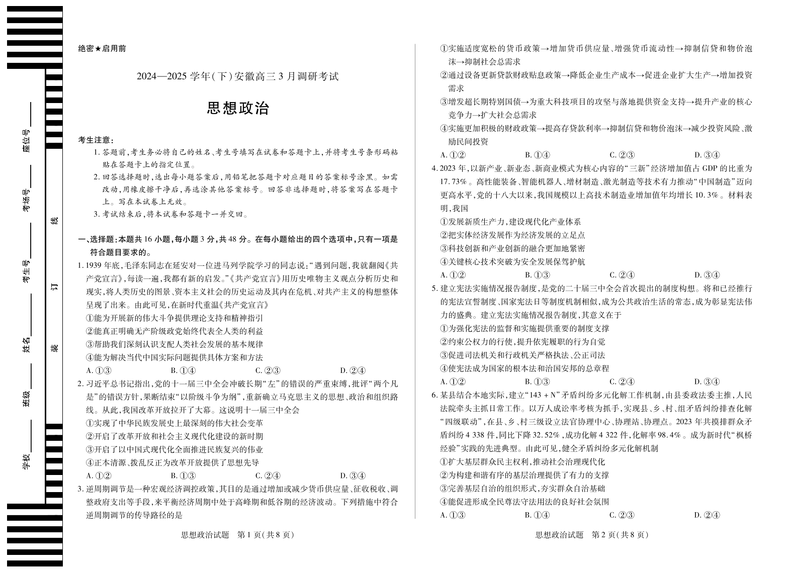 安徽省天一大联考2024-2025学年(下)高三3月调研考试 政治.pdf