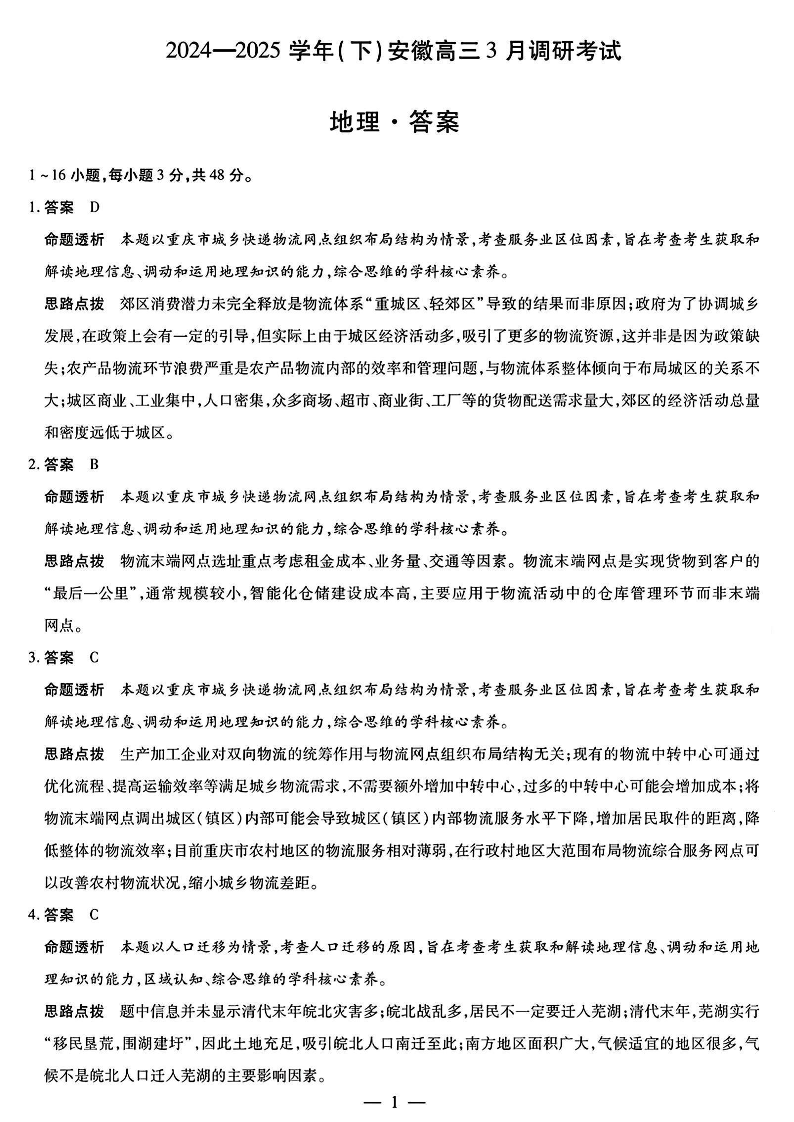 安徽省天一大联考2024-2025学年(下)高三3月调研考试 地理答案.pdf