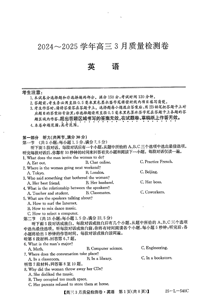山西省三晋卓越联盟2025届高三3月联考 英语(含答案).pdf