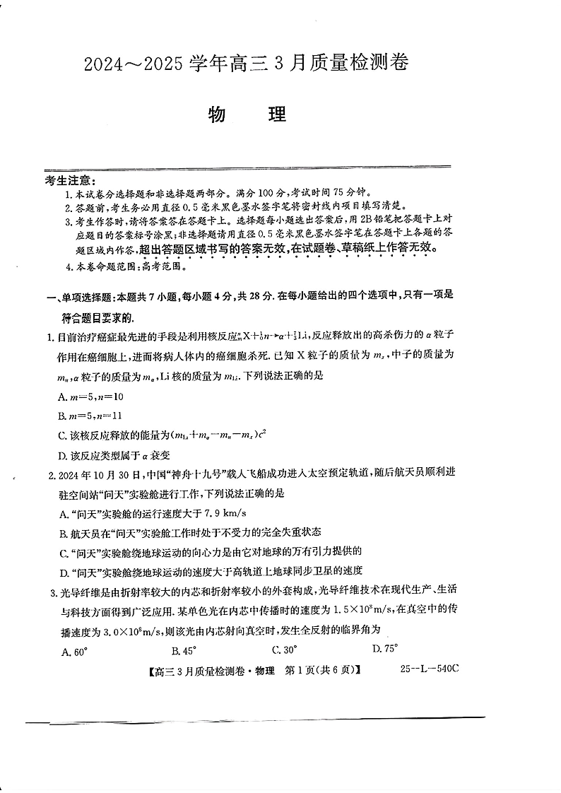 山西省三晋卓越联盟2025届高三3月联考 物理(含答案).pdf