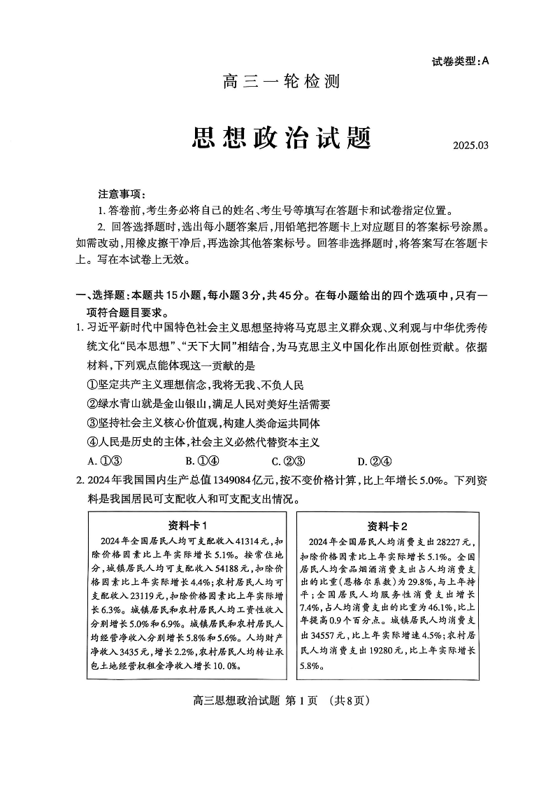 山东省泰安市2025届高三一轮检测(泰安一模)政治(含答案).pdf
