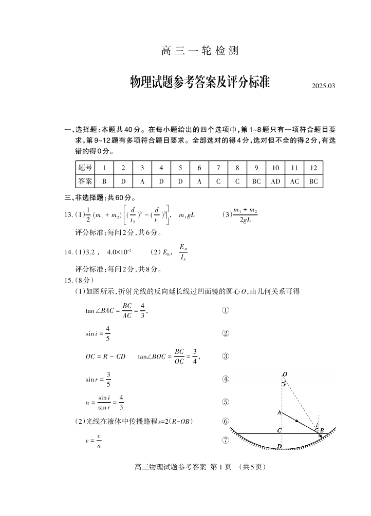 山东省泰安市2025届高三一轮检测(泰安一模)物理答案.pdf