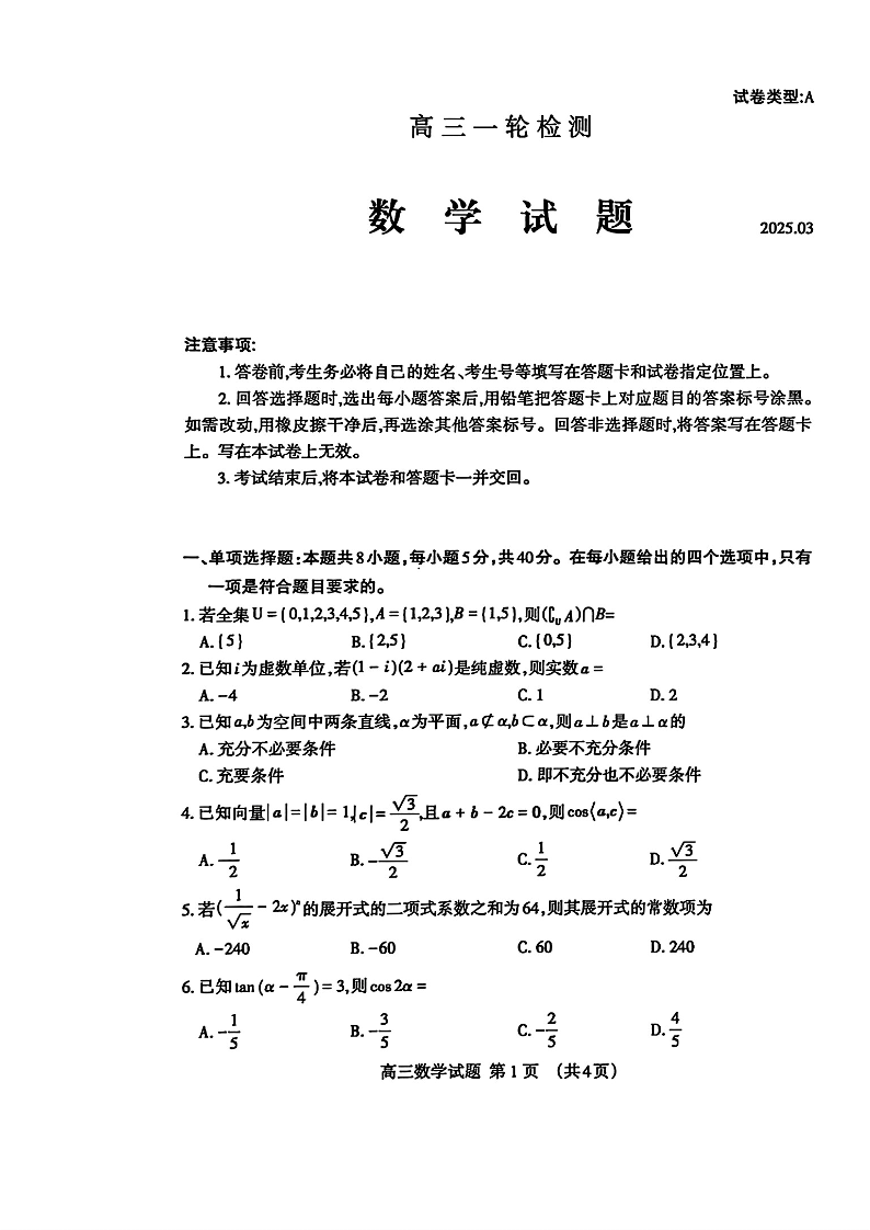 山东省泰安市2025届高三一轮检测(泰安一模)数学.pdf