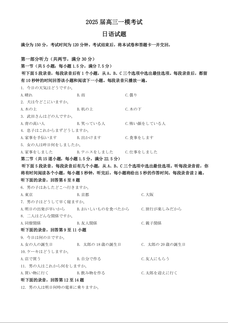 山东省泰安市2025届高三一轮检测(泰安一模)日语.docx