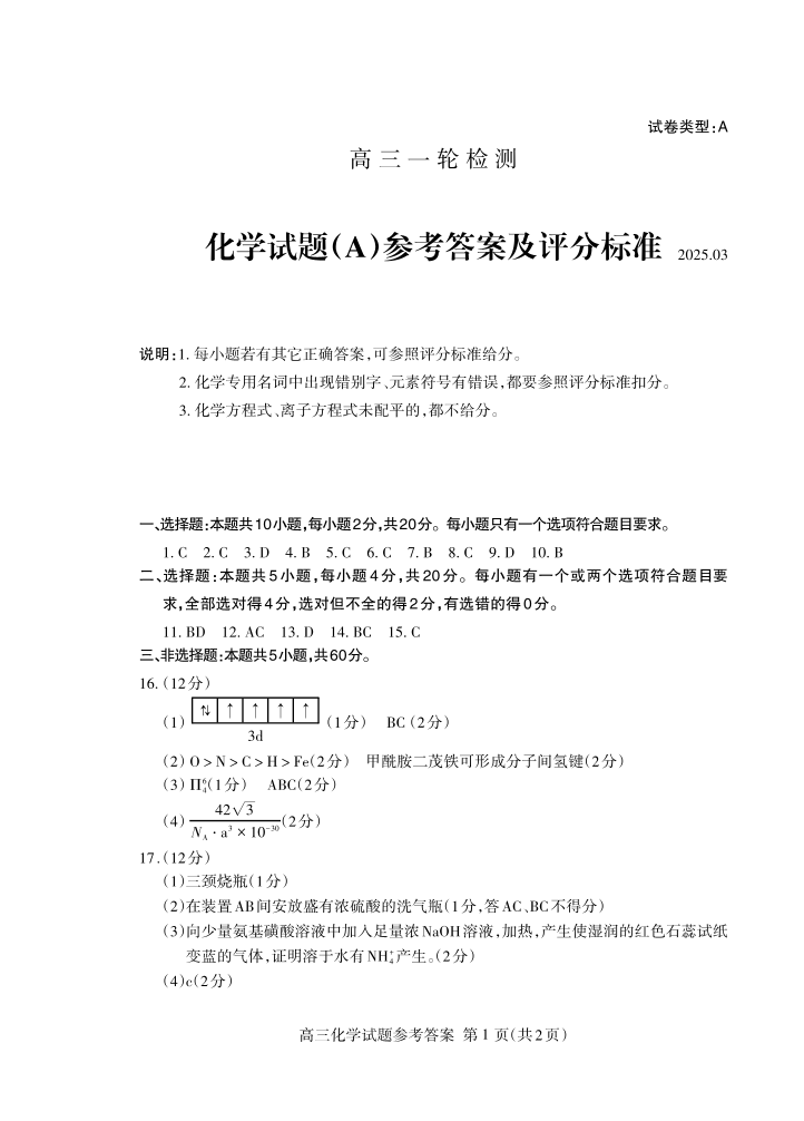 山东省泰安市2025届高三一轮检测(泰安一模)化学答案.pdf