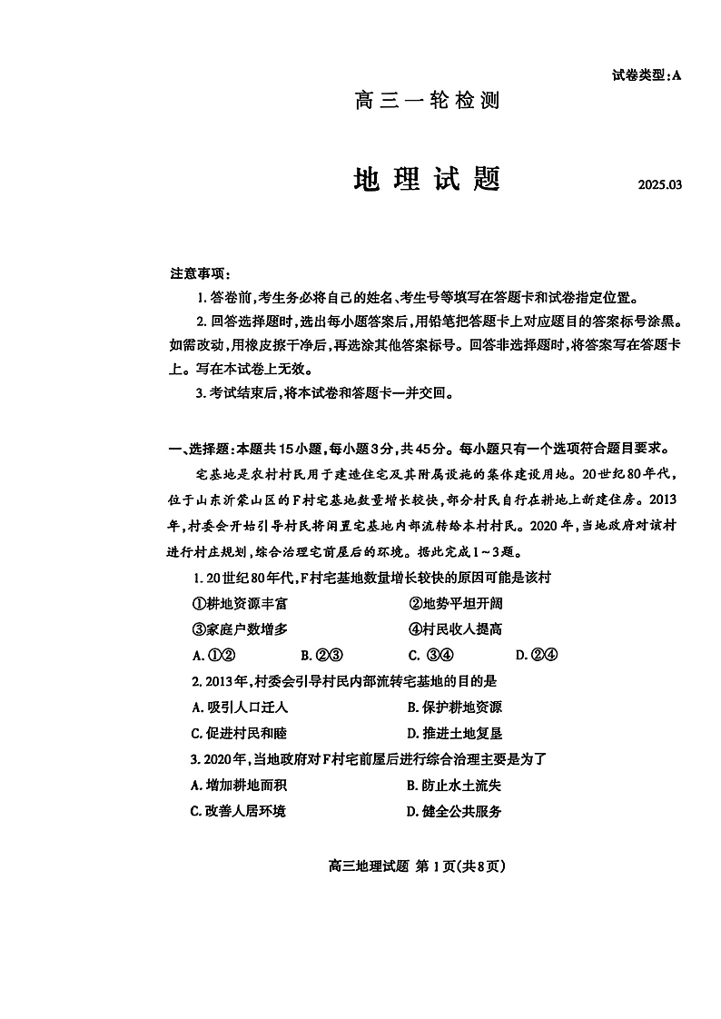 山东省泰安市2025届高三一轮检测(泰安一模)地理.pdf