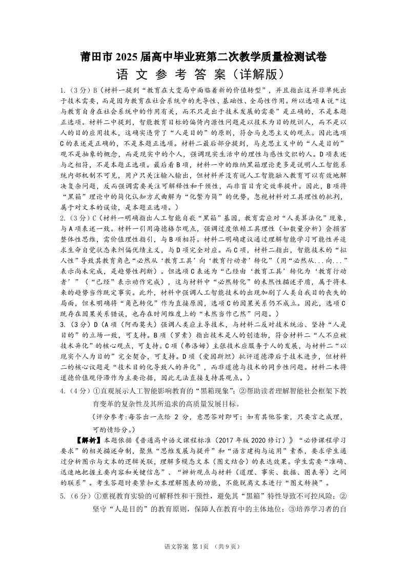 莆田市2025届高中毕业班第二次教学质量检测 语文答案.pdf