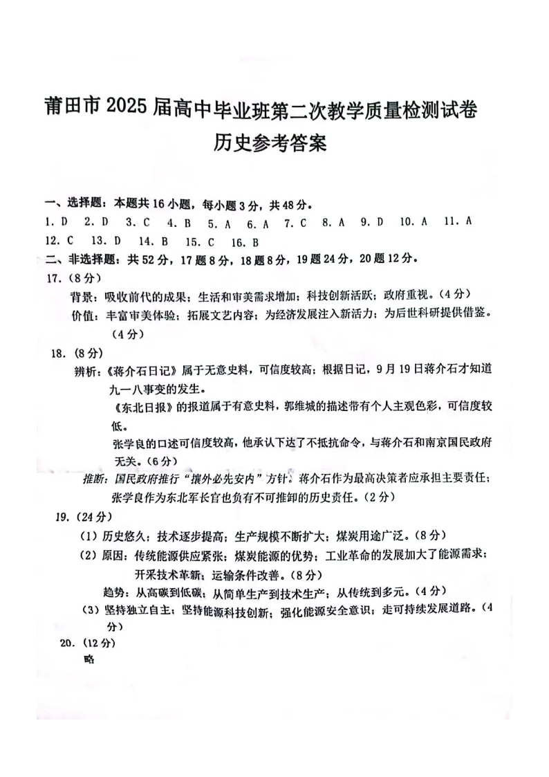 莆田市2025届高中毕业班第二次教学质量检测 历史答案.pdf