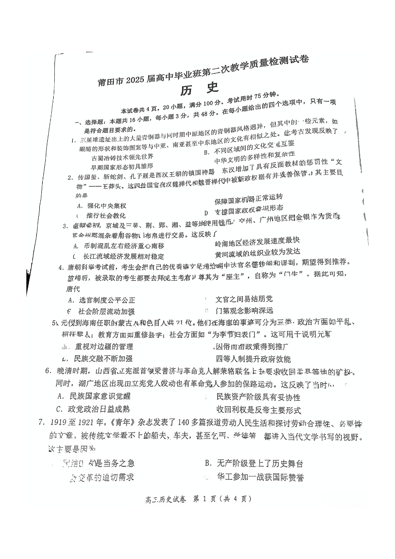 莆田市2025届高中毕业班第二次教学质量检测 历史.pdf