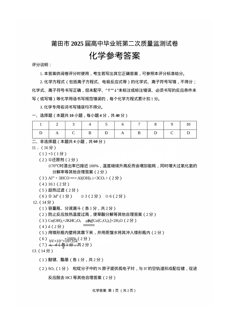 莆田市2025届高中毕业班第二次教学质量检测 化学答案.pdf