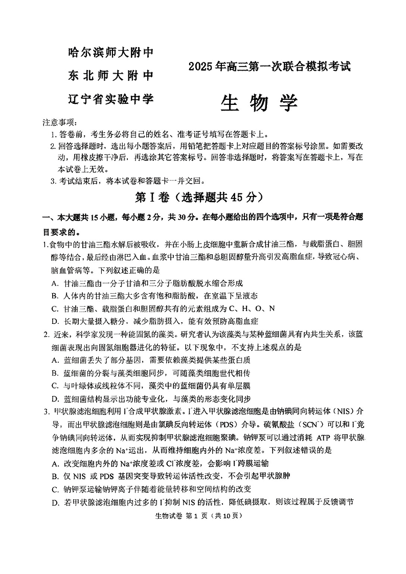 东北三省三校2025年高三第一次联合模拟考试 生物.pdf