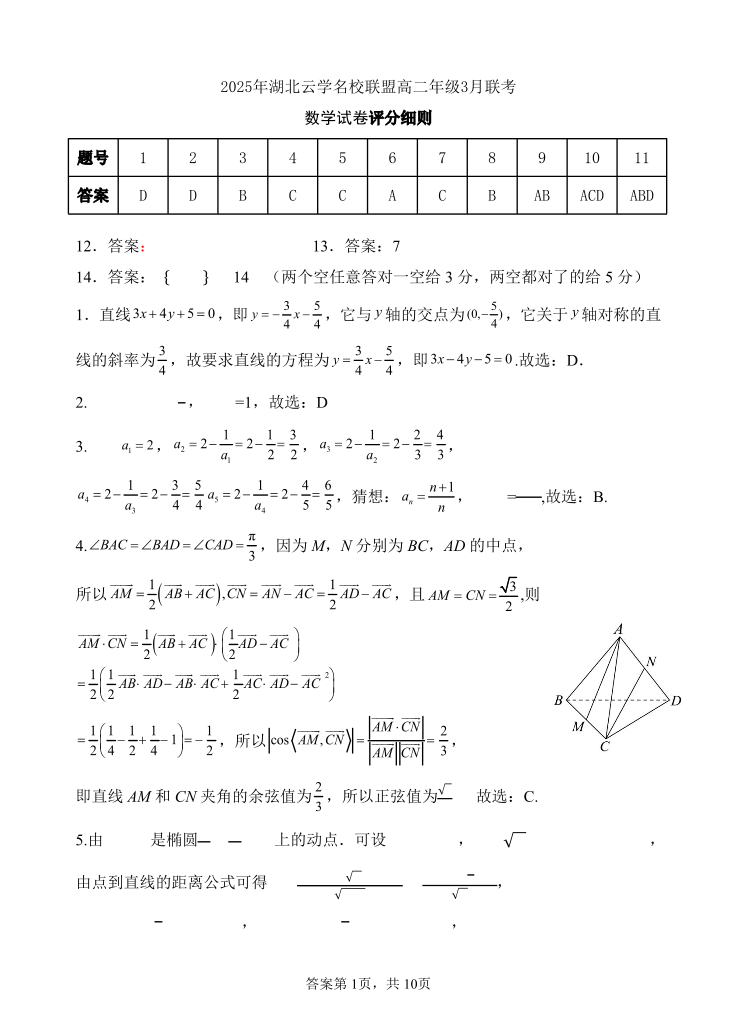 2025年湖北云学名校联盟高二年级3月联考 数学参考答案.pdf