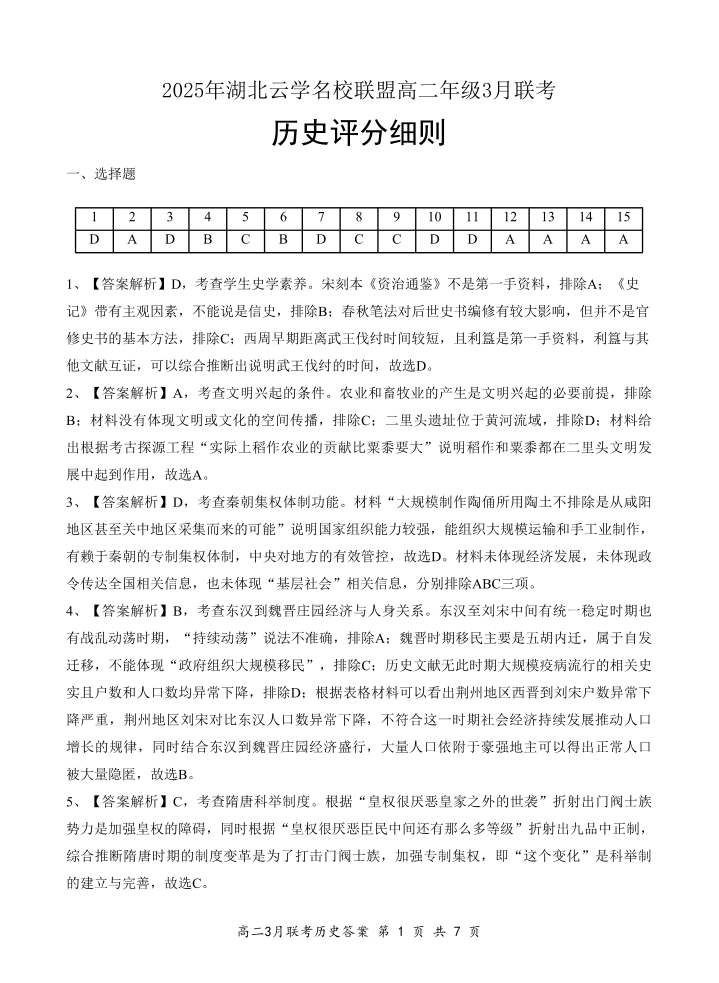 2025年湖北云学名校联盟高二年级3月联考 历史参考答案.pdf