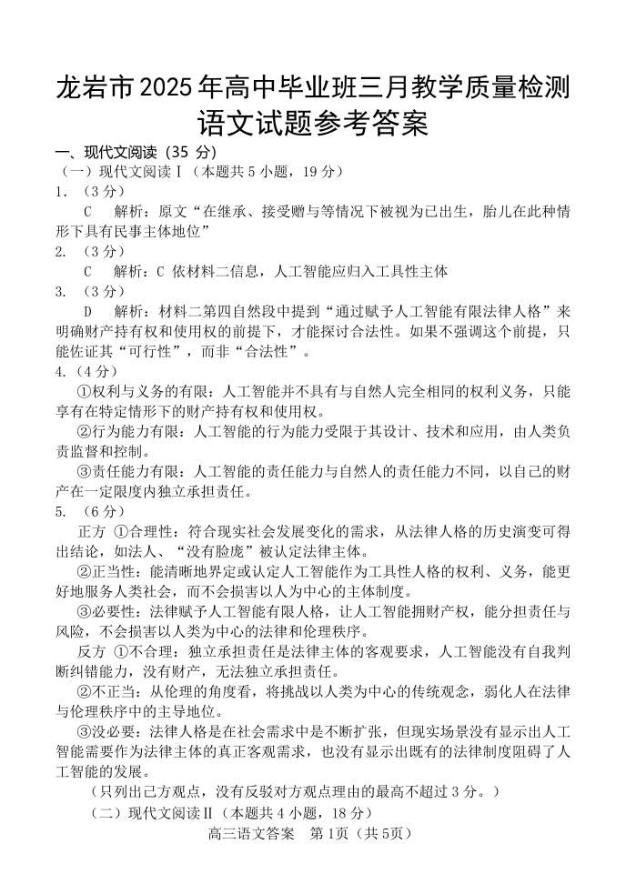福建省龙岩市2025年高中毕业班三月教学质量检测 语文答案.pdf