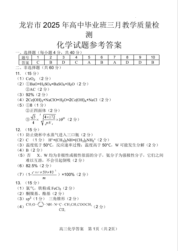 福建省龙岩市2025年高中毕业班三月教学质量检测 化学答案.docx