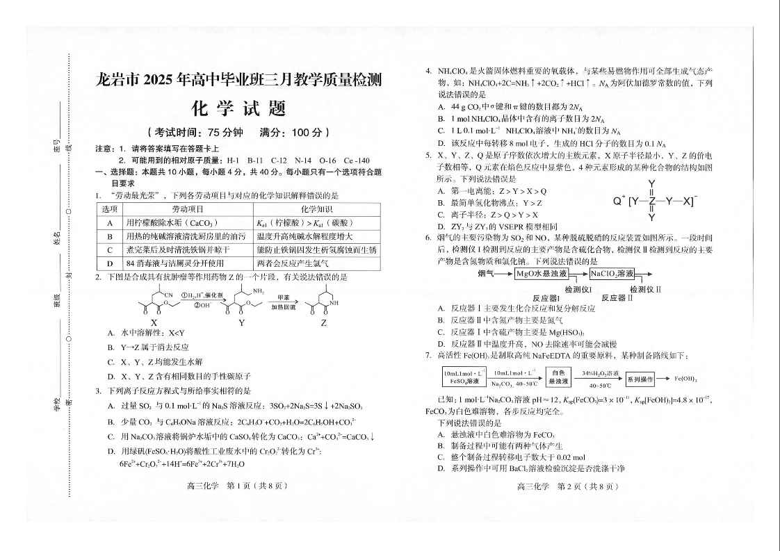 福建省龙岩市2025年高中毕业班三月教学质量检测 化学.docx