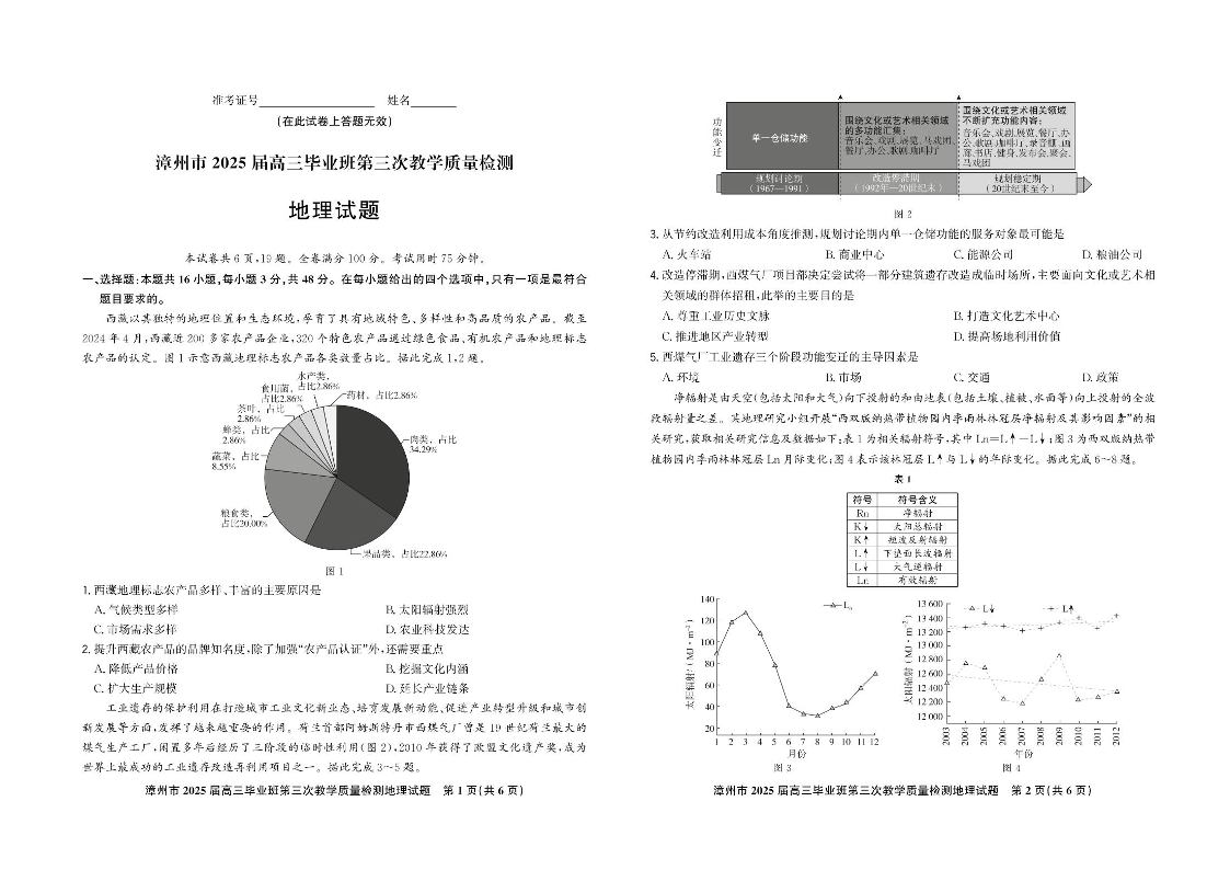福建省漳州市2025届高三毕业班第三次教学质量检测 地理(含答案).pdf