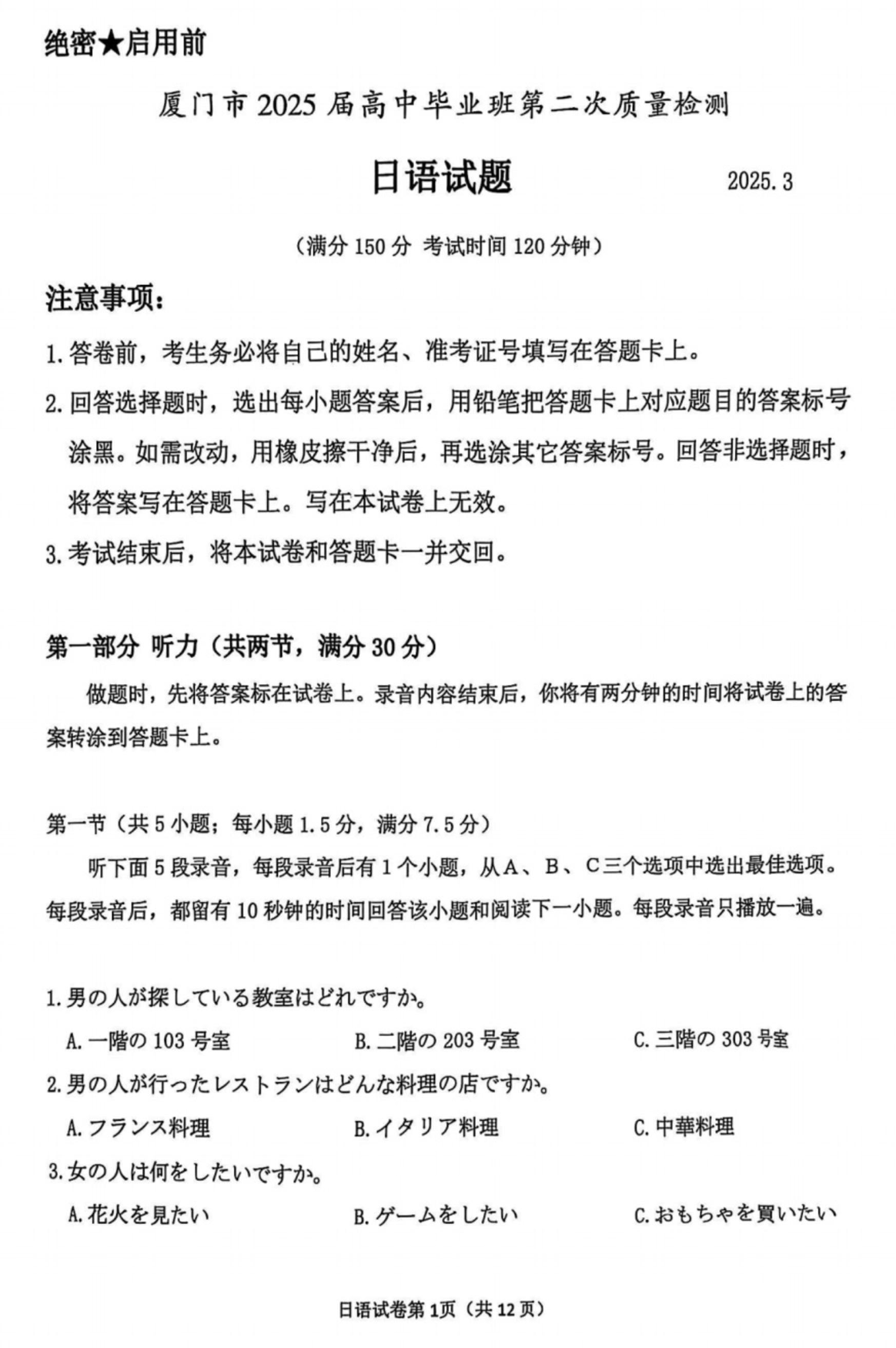 福建省厦门市2025届高中毕业班第二次质量检测 日语.pdf