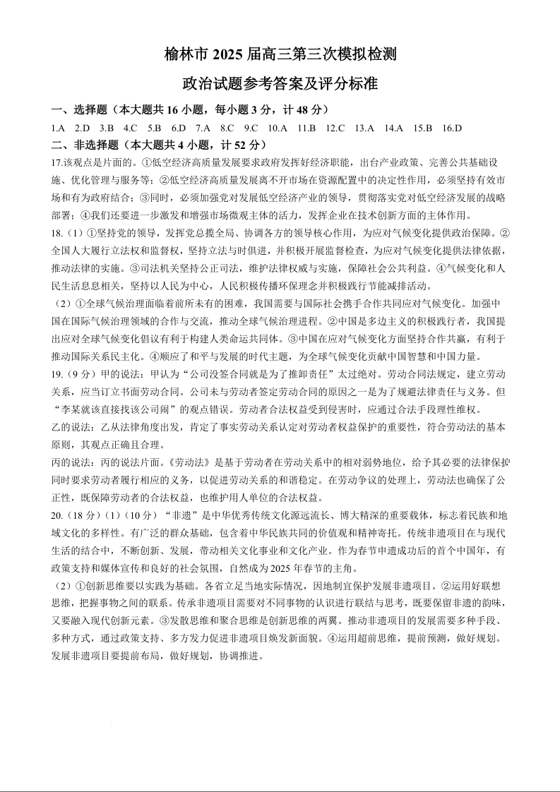 榆林市2025届高三第三次模拟检测 政治答案.docx