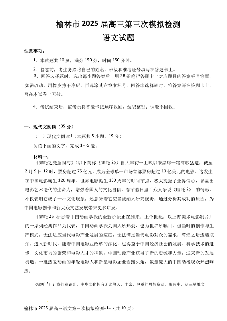 榆林市2025届高三第三次模拟检测 语文.docx