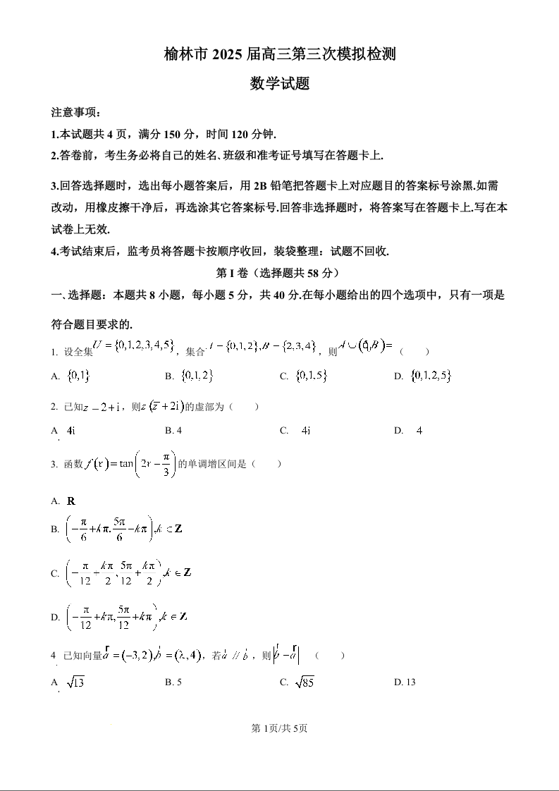 榆林市2025届高三第三次模拟检测 数学.docx
