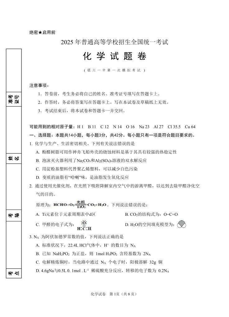 宁夏银川一中2025届高三下学期第一次模拟考试 化学.pdf
