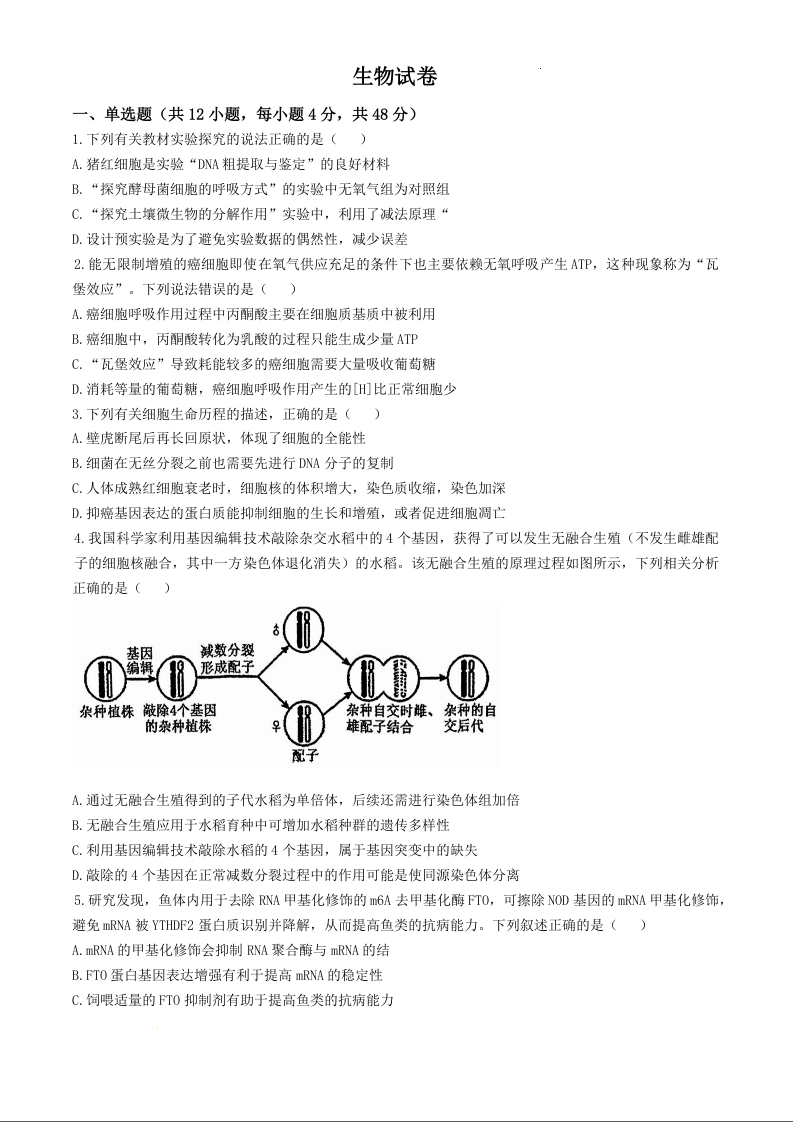 天津市武清区杨村第一中学2025届高三下学期一模 生物(含答案).docx