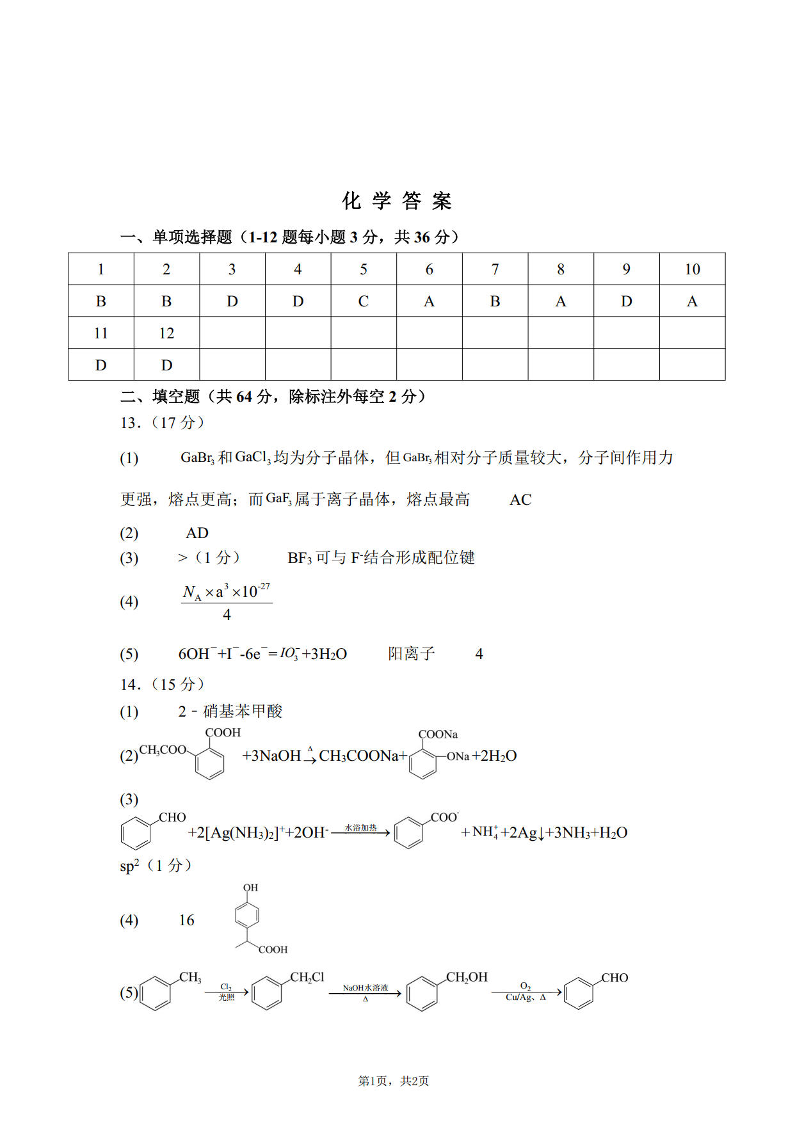 天津市武清区杨村第一中学2025届高三下学期一模 化学答案.pdf