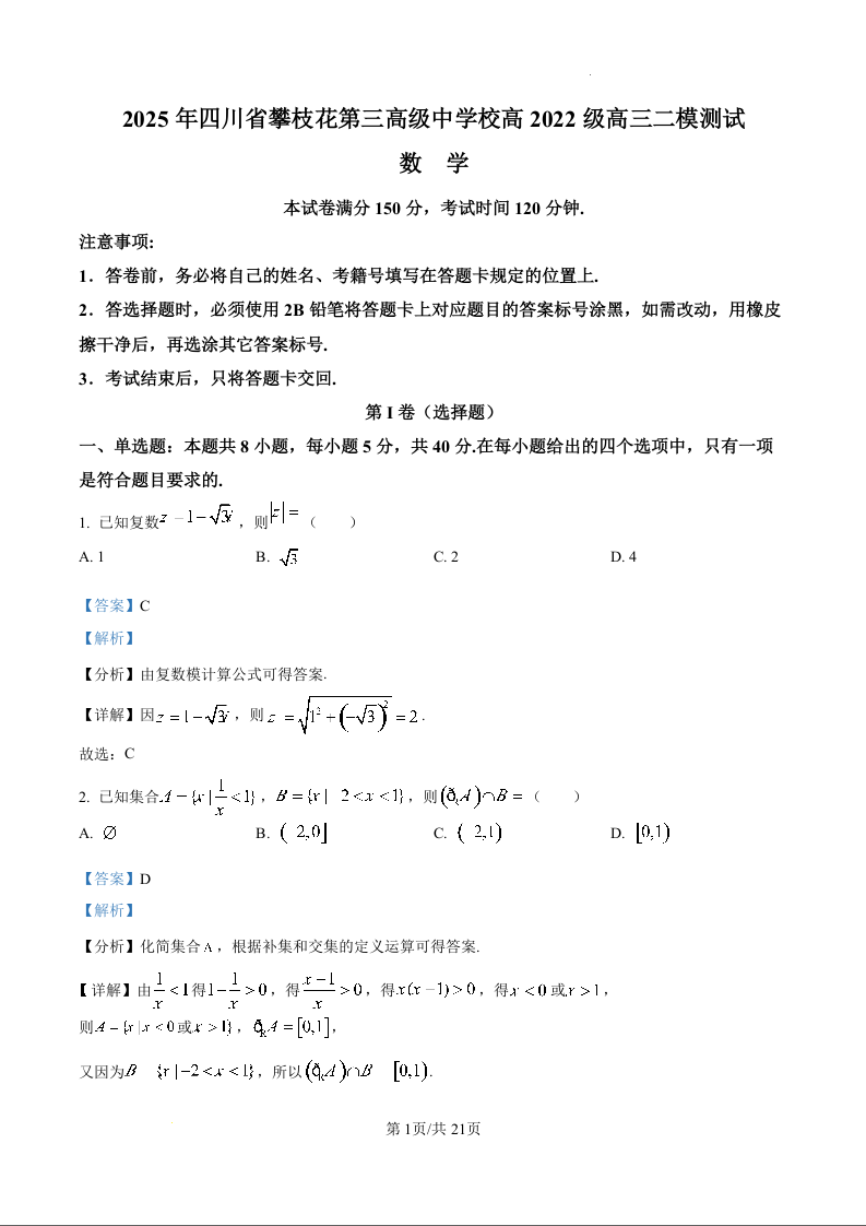 四川省攀枝花市第三高级中学2025届高三下学期二模考试 数学答案.docx