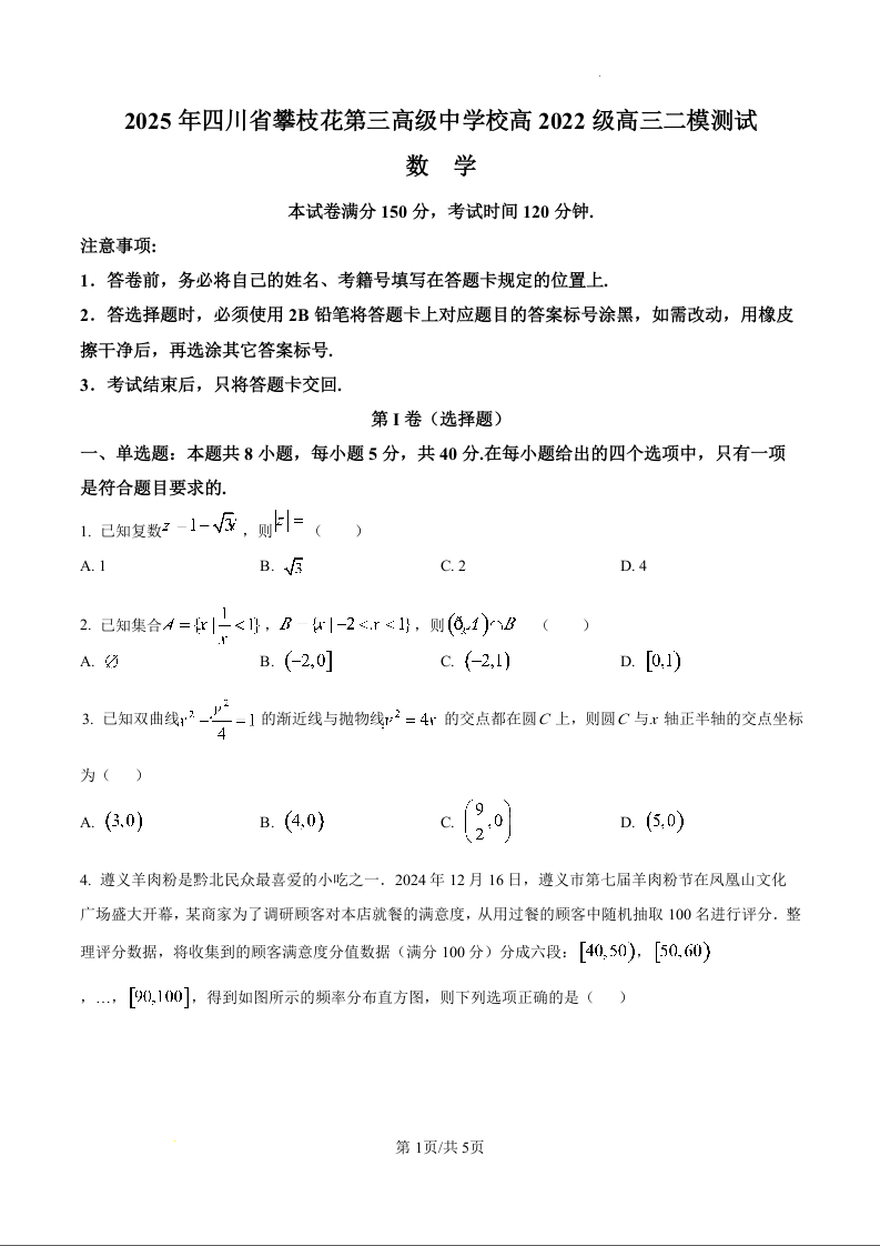 四川省攀枝花市第三高级中学2025届高三下学期二模考试 数学.docx