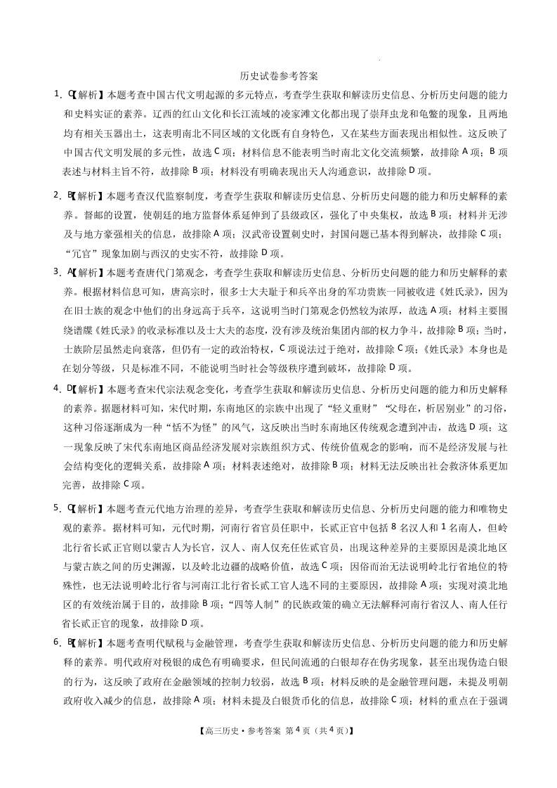 辽宁省抚顺市六校协作体2025届高三下学期期初检测 历史答案.docx