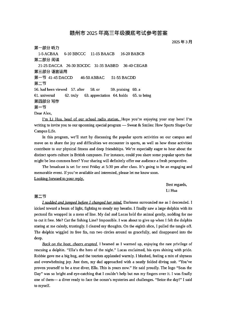 江西省赣州市2025年高三年级3月摸底考试 英语答案.pdf
