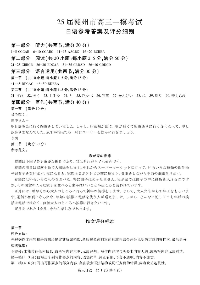 江西省赣州市2025年高三年级3月摸底考试 日语答案.pdf