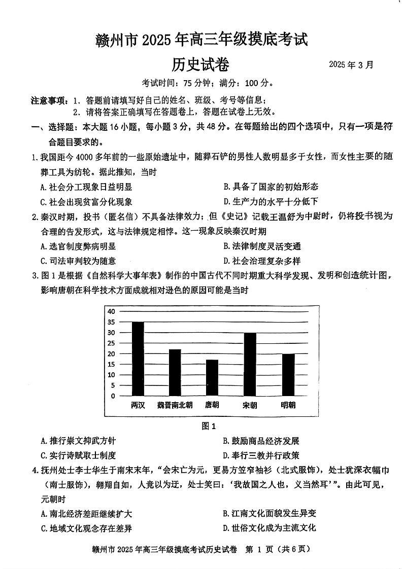 江西省赣州市2025年高三年级3月摸底考试 历史.pdf