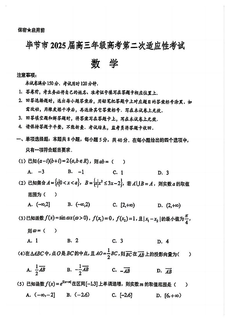 毕节市2025届高三年级高考第二次适应性考试 数学.pdf